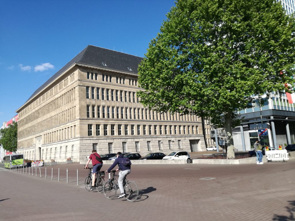 Rechts neben dem Behrensbau steht ein modernes Hochhaus, das ebenfalls zu den Inkunabeln der Architekturgeschichte zählt: Das von Paul Schneider-Esleben entworfene Mannesmann-Hochhaus.