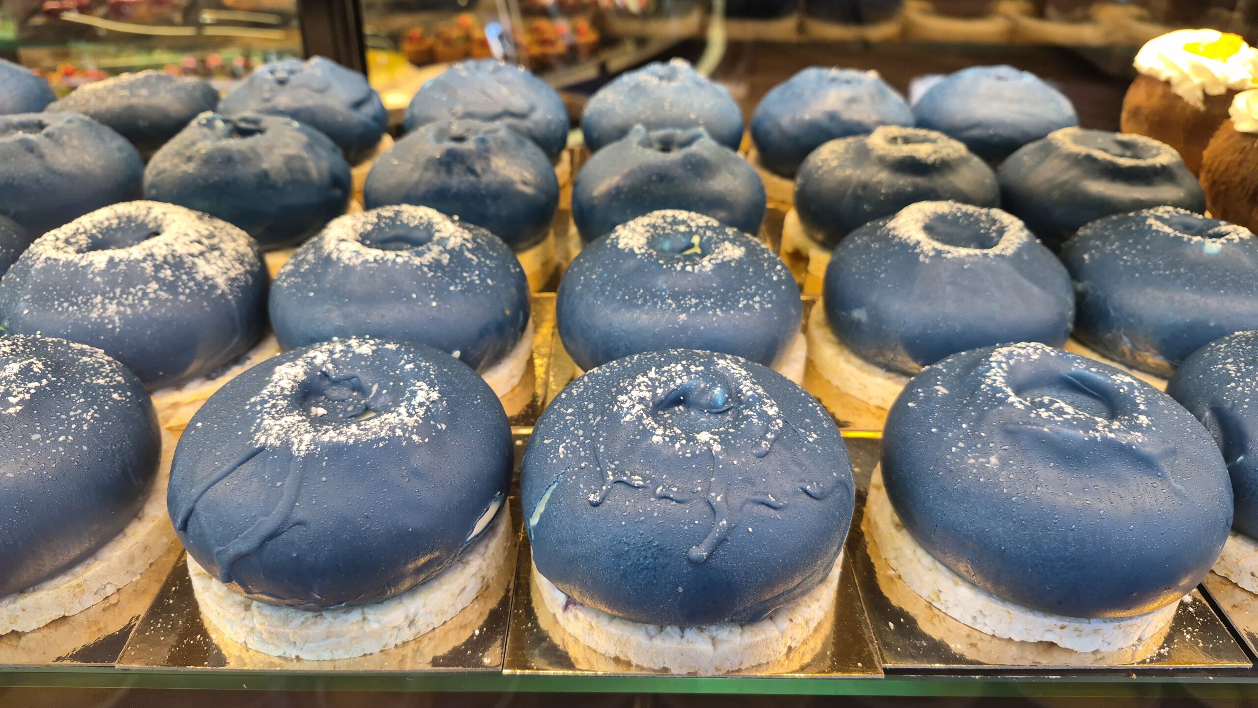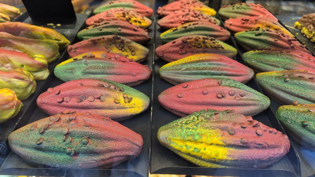 In letzter Zeit habe ich diese Früchte in etlichen Konditoreien entdeckt. Bei „Moccali“ in der Liesegangstraße – nur wenige Schritte südlich der Schadowstraße – ist die Auswahl recht groß. Neben den fast schon obligatorischen Pistazien und Mangos liegen dort Himbeeren, Heidelbeeren, Erdnüsse, Kaffee- und Kakaobohnen auf Reiscrackern zu einem Preis von 10 Euro pro Früchtchen: