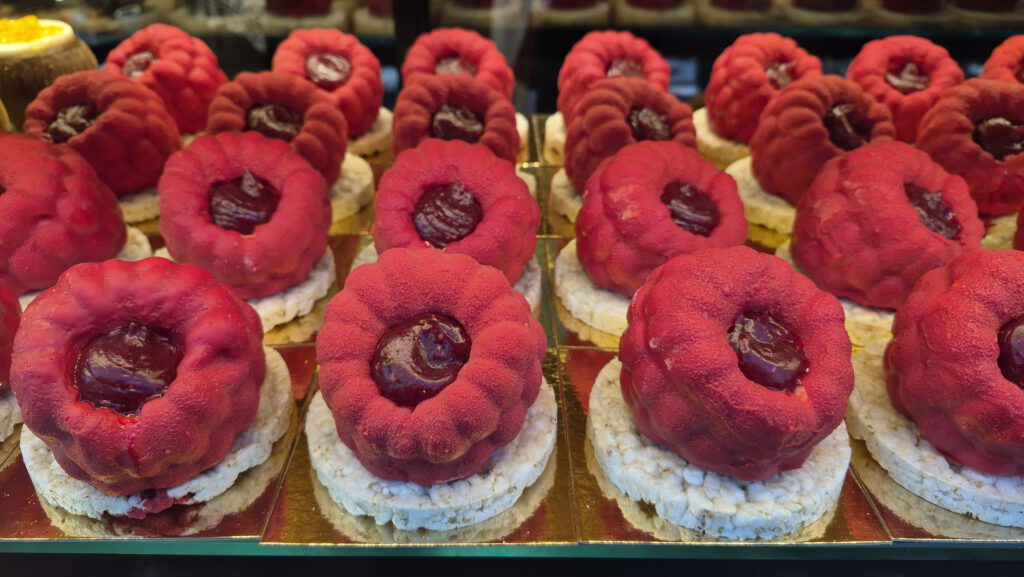 Mal liegen in der Auslage von Pure Pastry auf dem Carlsplatz-Markt gelbe Zitronen, am nächsten Tag grüne Äpfel. Dann wieder – wie auf dem Foto – rote Äpfel und überdimensionierte Pistazien.
