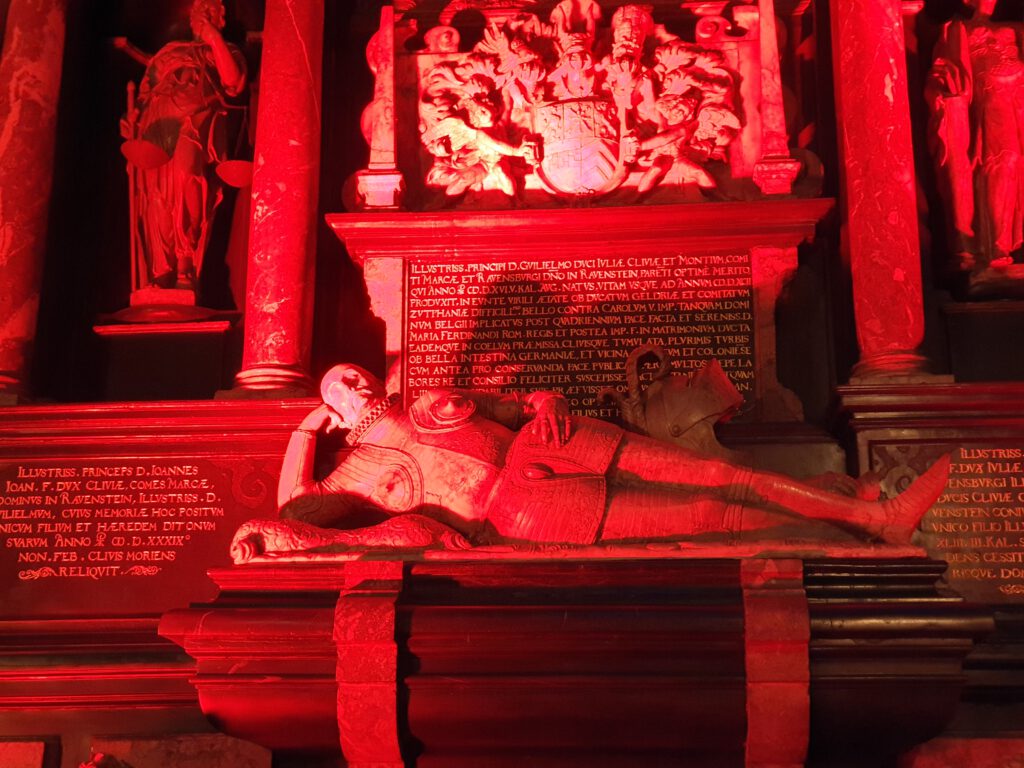 Hinter dem Altar der Kirche St. Lambertus in der Altstadt verbirgt sich ein kleines „Geheimnis“. Natürlich ist das Grabmal von Wilhelm dem Reichen nicht geheim – und trotzdem vielen Besuchern nicht bekannt. Deshalb widme ich diesen Blog-Beitrag unserem Herzog von Jülich-Kleve-Berg sowie Graf von Mark und Ravensberg Wilhelm V. Geboren wurde er 1516 und starb am 5. Januar 1592 – heute ist das auf den Tag genau 434 Jahre her.