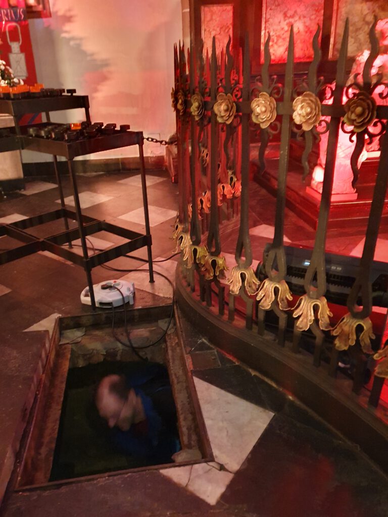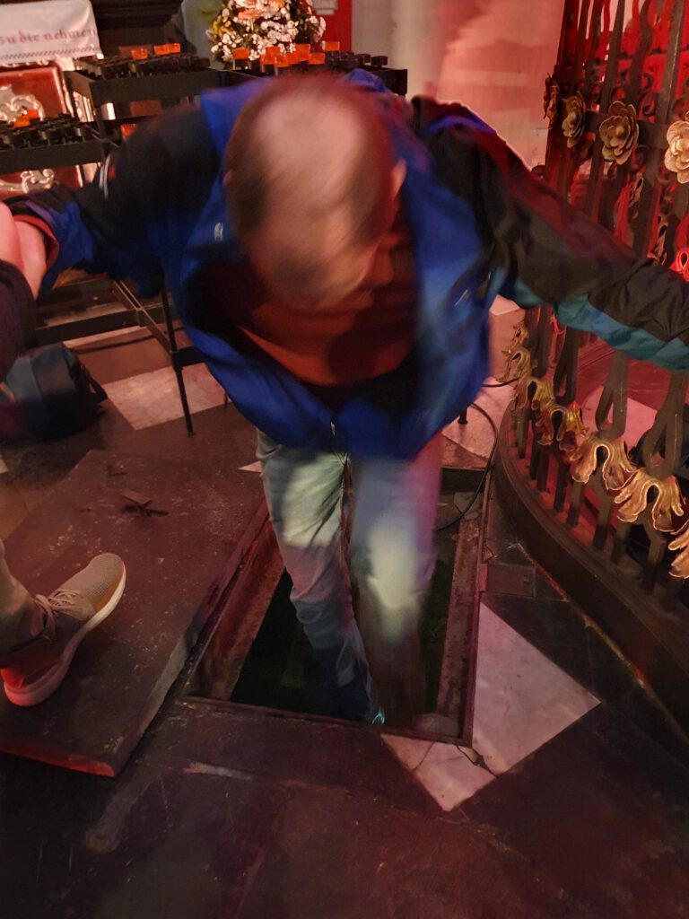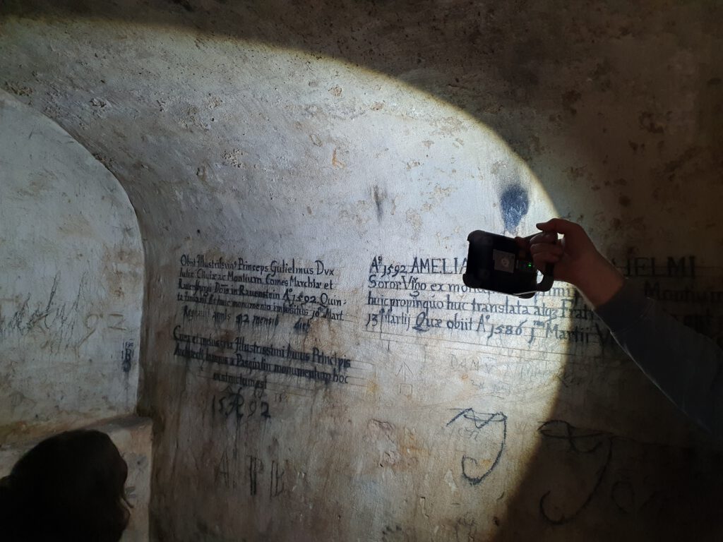 Durch ein wirklich kleines Loch im Boden gelangt man in die Fürstengruft – per angelehnter Leiter. Ein gar nicht fürstlicher oder gar bequemer Abstieg, den ich im April 2023 anlässlich der Nacht der Museen machen durfte: