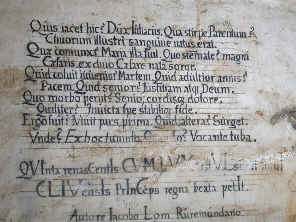 Wer liegt hier? Der Herzog von Jülich. Aus welchem Elterngeschlecht? Er wurde geboren aus dem erlauchten Geblüt der Klever. Welche war seine Gemahlin? Maria ist jene gewesen. Aus welchem Stamm? Des großen Kaisers Schwester, von dem seligen Kaiser abstammend. Wem diente er als junger Mann? Dem Krieg. Wem in den Jahren als Erwachsener? Dem Frieden. Wem als Greis? Der Gerechtigkeit und Gott. An welcher Krankheit verstarb er? An Altersschwäche und Leiden des Herzens. Wie? In der Hoffnung unbesiegt und im Glauben nicht wankend. Also ist er vergangen? Der erste Teil lebt. Was (tut) der andere? Er wird auferstehen. Von wo? Aus diesem Grab. Wann? Wenn die Posaune ruft. Als das fünfte Licht des neu erstandenen Jahres aufgeleuchtet hatte, strebte der klevische Fürst zu dem seligen Königreich. Von dem Verfasser Jakob Lom aus Roermond.