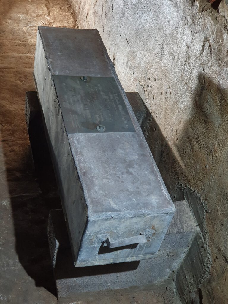 Dort unten stehen die Blei-Sarkophage – aufgebockt wegen der Feuchtigkeit im Gemäuer und vielleicht auch wegen gelegentlicher Hochwasser:
