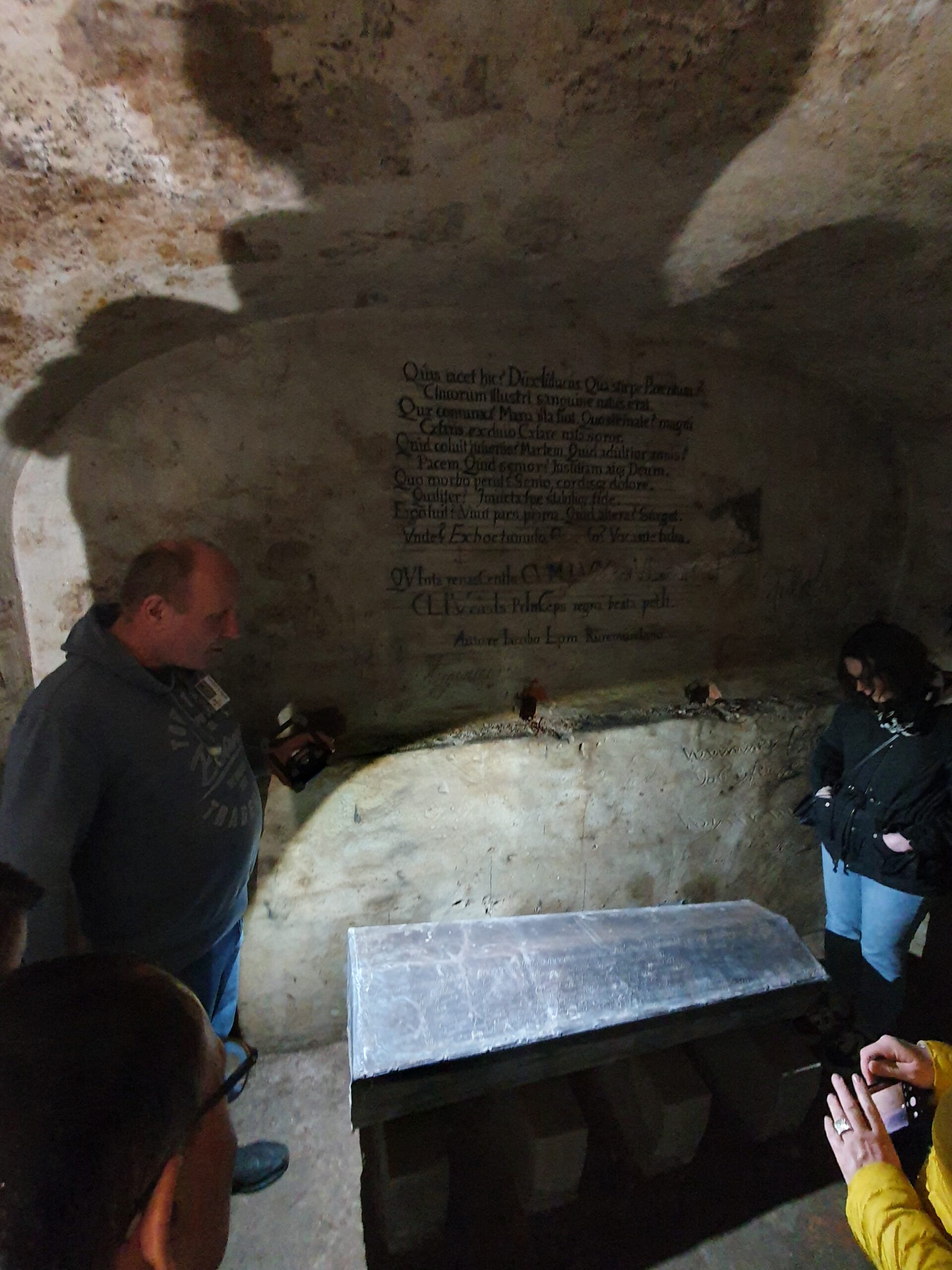 Dort unten stehen die Blei-Sarkophage – aufgebockt wegen der Feuchtigkeit im Gemäuer und vielleicht auch wegen gelegentlicher Hochwasser:
