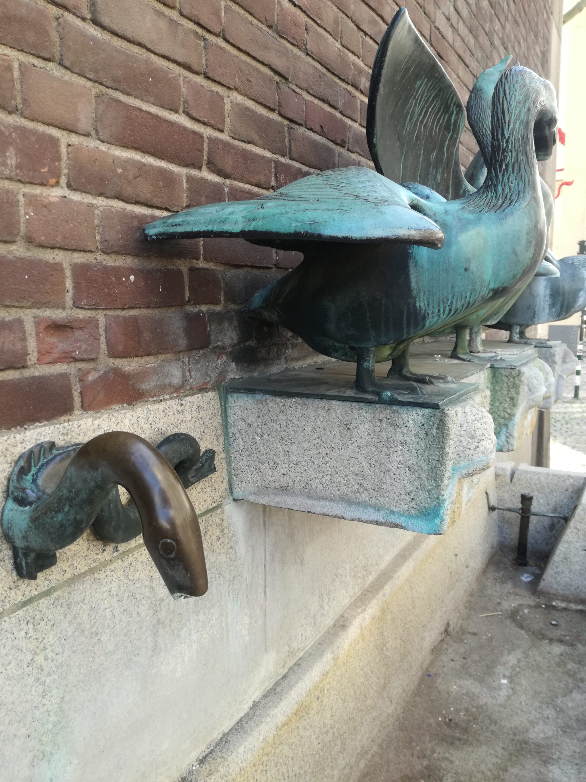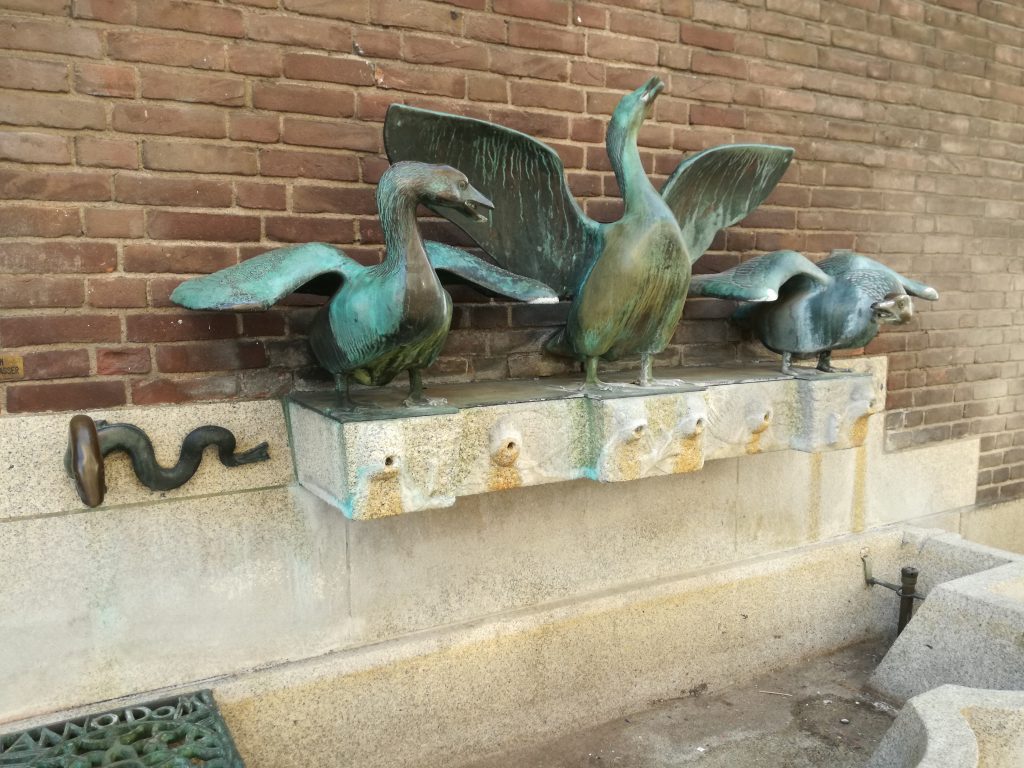 Die grün patinierte Figurengruppe zeigt drei Gänse, die Wasser speien. Auf der linken Seite speit eine Wasserschlange. Die lebensgroßen Gänse wirken lebendig. Diesen Eindruck unterstützen die sich kreuzenden Wasserstrahlen, die aus den Schnäbeln der Tiere ins Becken spritzen. Ich denke immer an die Gänse der Juno, die einst mit ihrem aufgeregten Geschnatter die Römer vor einem Überfall durch die Kelten warnten und so Rom retteten. Es ist wohl kein Zufall, dass dieses Thema hier am Rathaus zu finden ist.