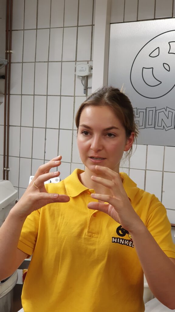 Die Chefin selbst führte uns durch die Backstube in der Hohe Straße: Sophie Hinkel ist eine Powerfrau – ständig in Bewegung, sodass auf kaum einem Foto sind die Hände scharf sind ;) Schon früh packte sie mit an, formte schon als Schülerin als Ferienjob bei Papa tagelang Brötchen und gab ihnen den typischen Schnitt. 2500 Brötchen pro Tag gingen durch ihre Hände. Dann studierte sie Internationales Management mit Schwerpunkt Personalwesen in Maastricht an der School of Business and Economics, absolvierte im eigenen Betrieb eine Bäcker-Ausbildung, auf den die Meisterschule folgte. Bei Brot kann man ihr nichts vormachen.