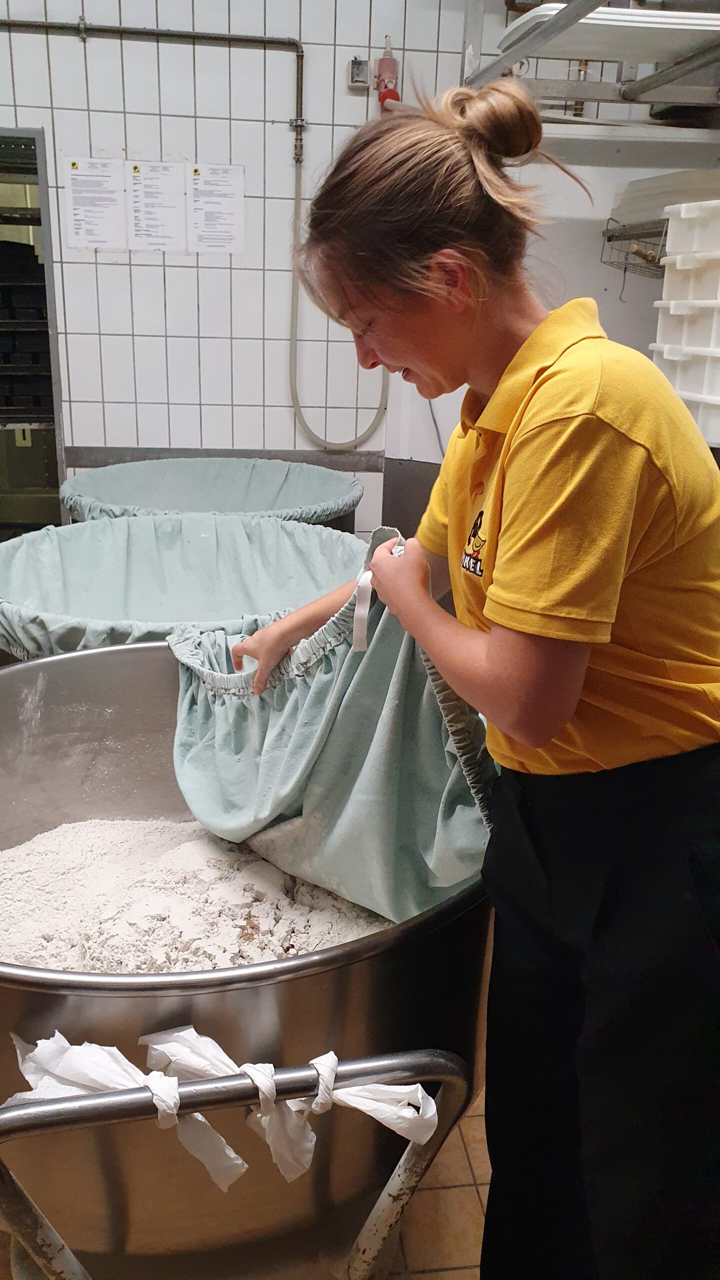 Die Chefin selbst führte uns durch die Backstube in der Hohe Straße: Sophie Hinkel ist eine Powerfrau – ständig in Bewegung, sodass auf kaum einem Foto sind die Hände scharf sind ;) Schon früh packte sie mit an, formte schon als Schülerin als Ferienjob bei Papa tagelang Brötchen und gab ihnen den typischen Schnitt. 2500 Brötchen pro Tag gingen durch ihre Hände. Dann studierte sie Internationales Management mit Schwerpunkt Personalwesen in Maastricht an der School of Business and Economics, absolvierte im eigenen Betrieb eine Bäcker-Ausbildung, auf den die Meisterschule folgte. Bei Brot kann man ihr nichts vormachen.