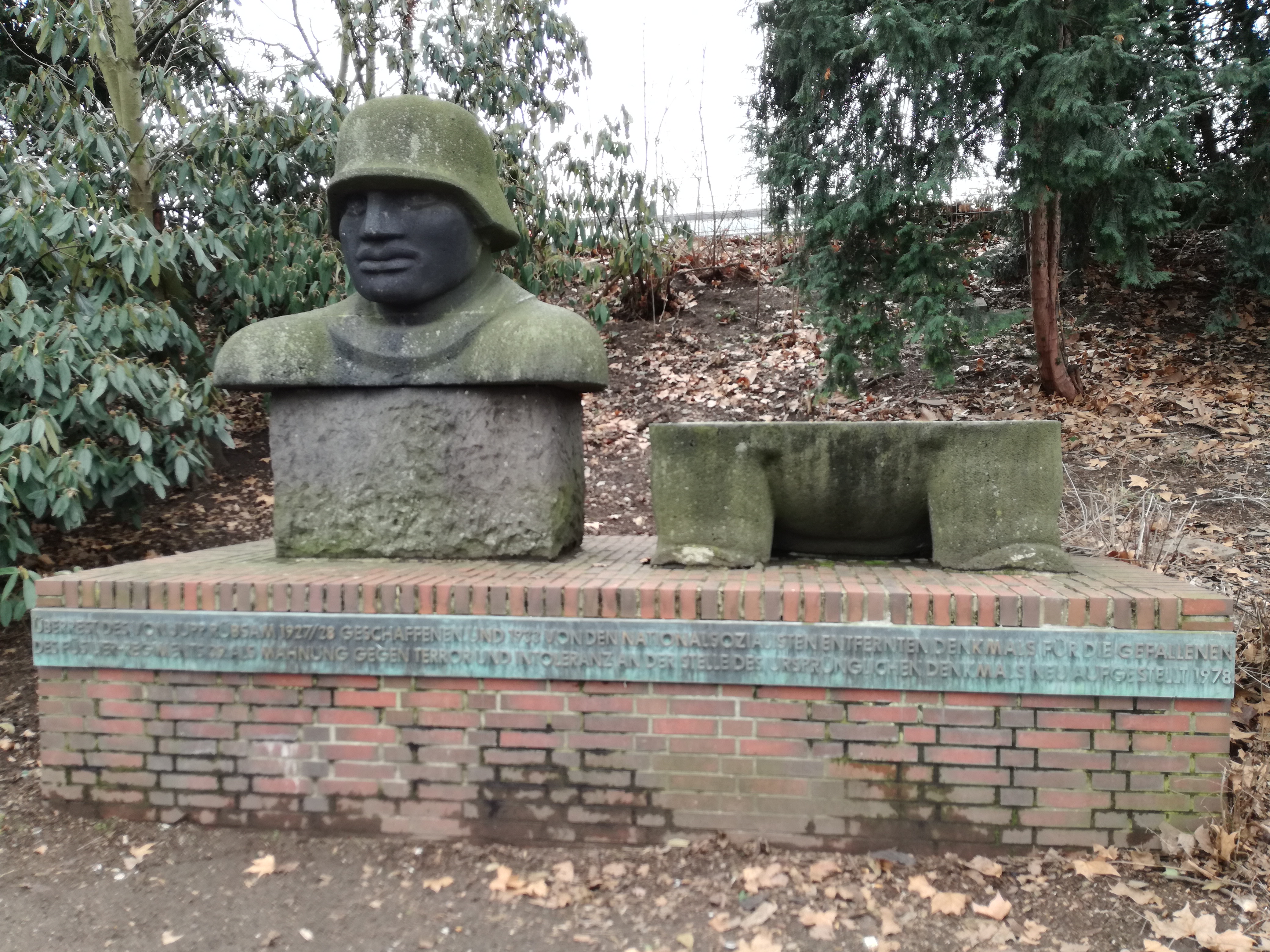 Als verbliebener Rest des Denkmals wurde der Kopf des Stahlhelm tragenden Kriegers 1978 etwa dort wieder aufgestellt, wo die Figurengruppe ihren ursprünglichen Platz hatte.“