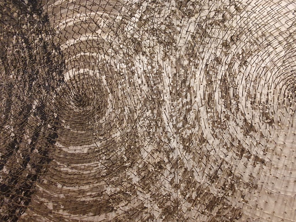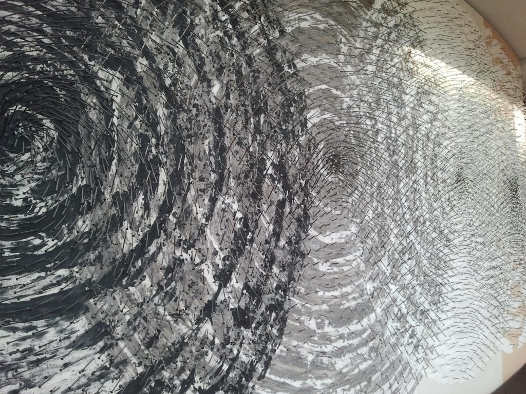 Das auffälligste Kunstwerk hängt in der Wandelhalle in der ersten Etage: ein Nagelbild von Günther Uecker, das den Titel „Interferenzen“ trägt. Ich habe es sowohl bei Sonnenschein mit vielen kleinen Schatten-Linien bewundert, als auch bei Streulicht ohne Schlagschatten. Vielleicht ist es ein Sinnbild für die Politik, die hier drin gemacht wird. Wo Reden wie Nägel einschlagen, wo man Positionen vertritt, wo sich die unterschiedlichen Parteien aber auch überschneiden, so wie hier die Kreise Schnittmengen bilden.