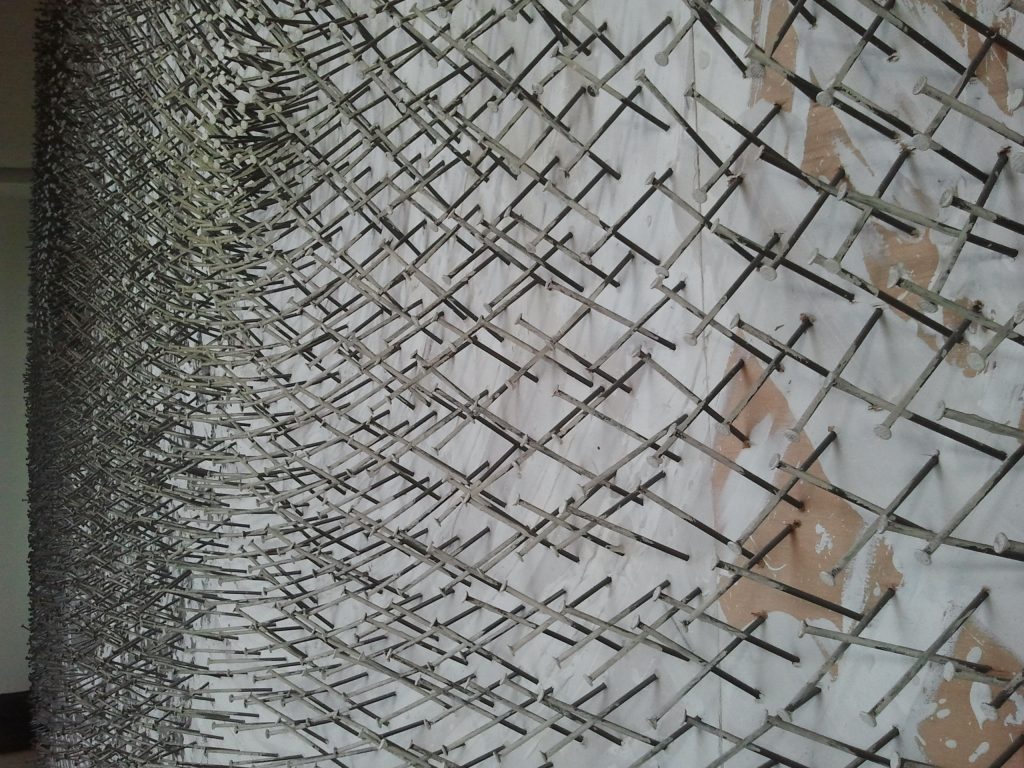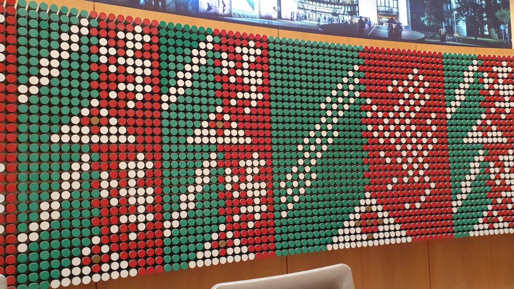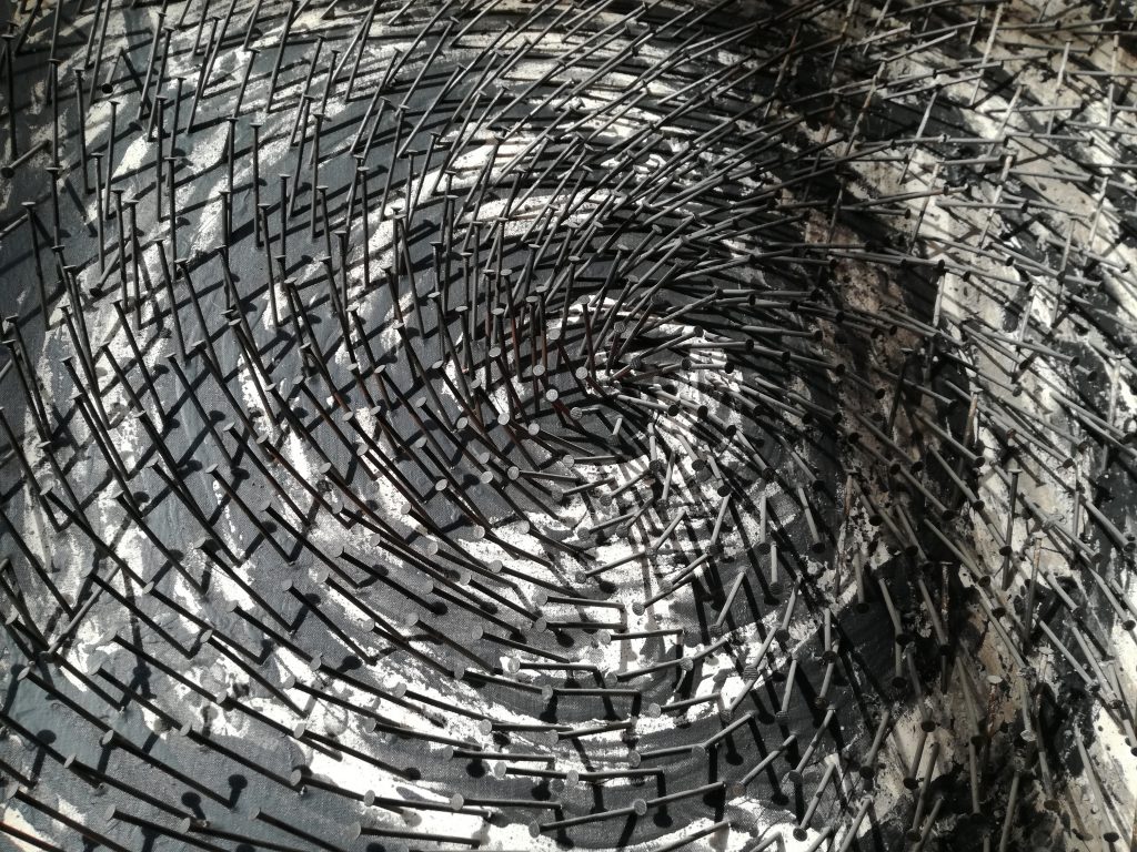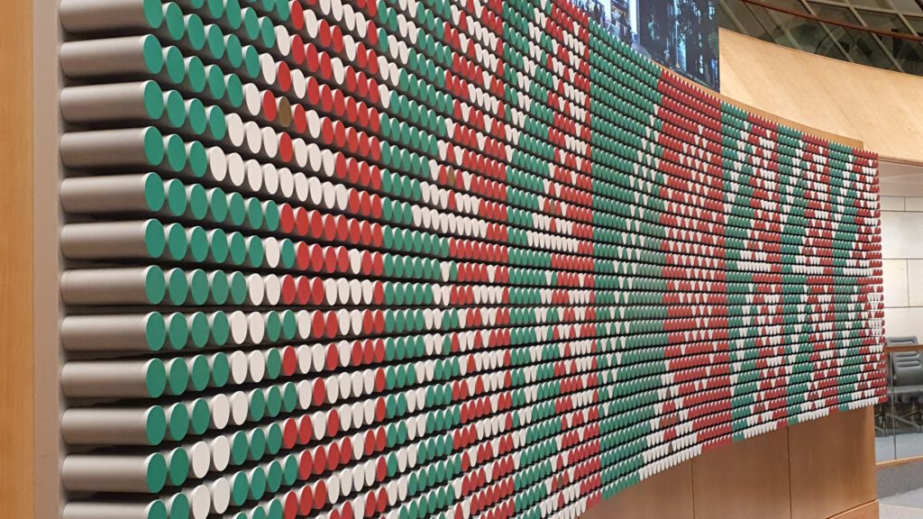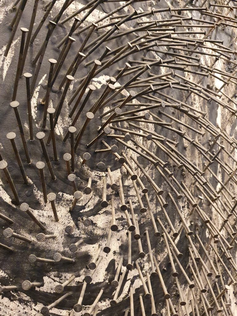 Bei der Parlamentsnacht 2025 bekam ich mit, wie ein junger Mann dieses Bild erklärte: Es gäbe eine Kiste voller Nägel, die unten stehe. Jeder, der sich über etwas ärgert, soll einen nehmen und in diese Wand schlagen… Ich hoffe, dass die Lauscher das als Ironie verstanden haben.