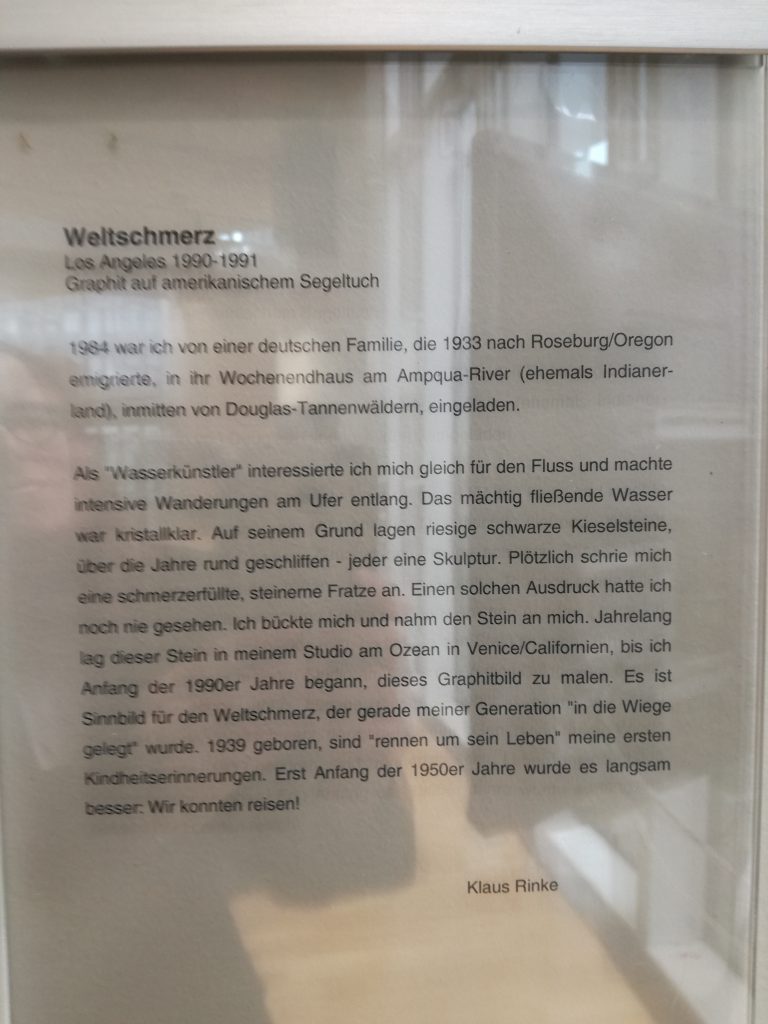 Der frühere Professor für Bildhauerei an der Düsseldorfer Kunstakademie Klaus Rinke ist fasziniert von Wasser. Ein von einem Blick auf von Wasser rundgeschliffene Steine in einem Fluss inspiriertes Bild mit dem Titel „Weltschmerz“ hängt ebenfalls im Landtag.