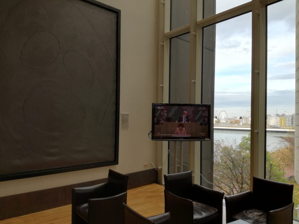 Über die Außen-Kunstwerke am und um den Landtag habe ich auch bereits geschrieben: Dani Karavans Kompass für die Abgeordneten – Tzaphon vor dem Eingang, auf der Rückseite Heinz Macks Landtagsbrunnen und in einem vom Rhein aus zugänglichen Halb-Innenhof Im Aufbruch.