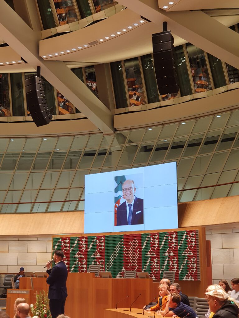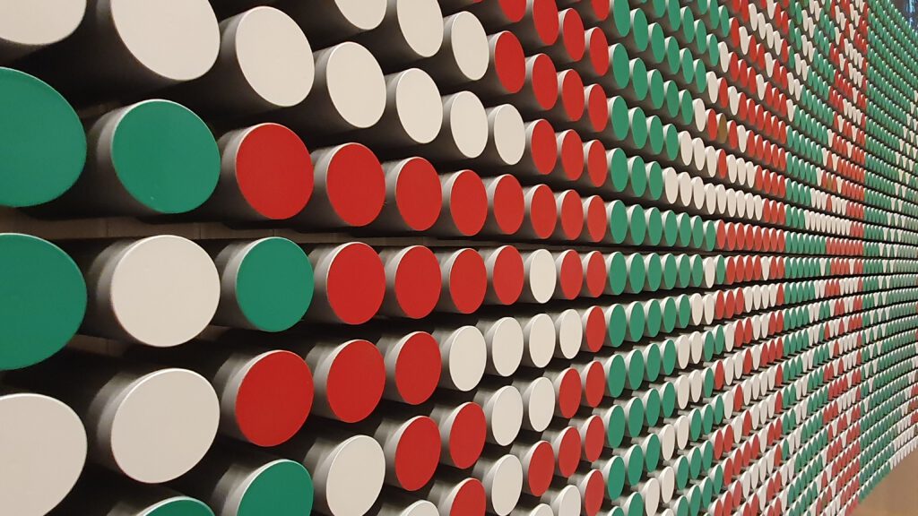 Das von den meisten Menschen angeschaute Kunstwerk im Landtag ist im Plenarsaal hinter dem Sprecherpult: das aus dreifarbigen Plexiglas-Zylindern zusammengesetzte Wappen des Landes Nordrhein-Westfalen. Es stammt von Ferdinand Kriwet. Über den unterschätzten Wort-Künstler habe ich in diesem Blog bereits geschrieben.