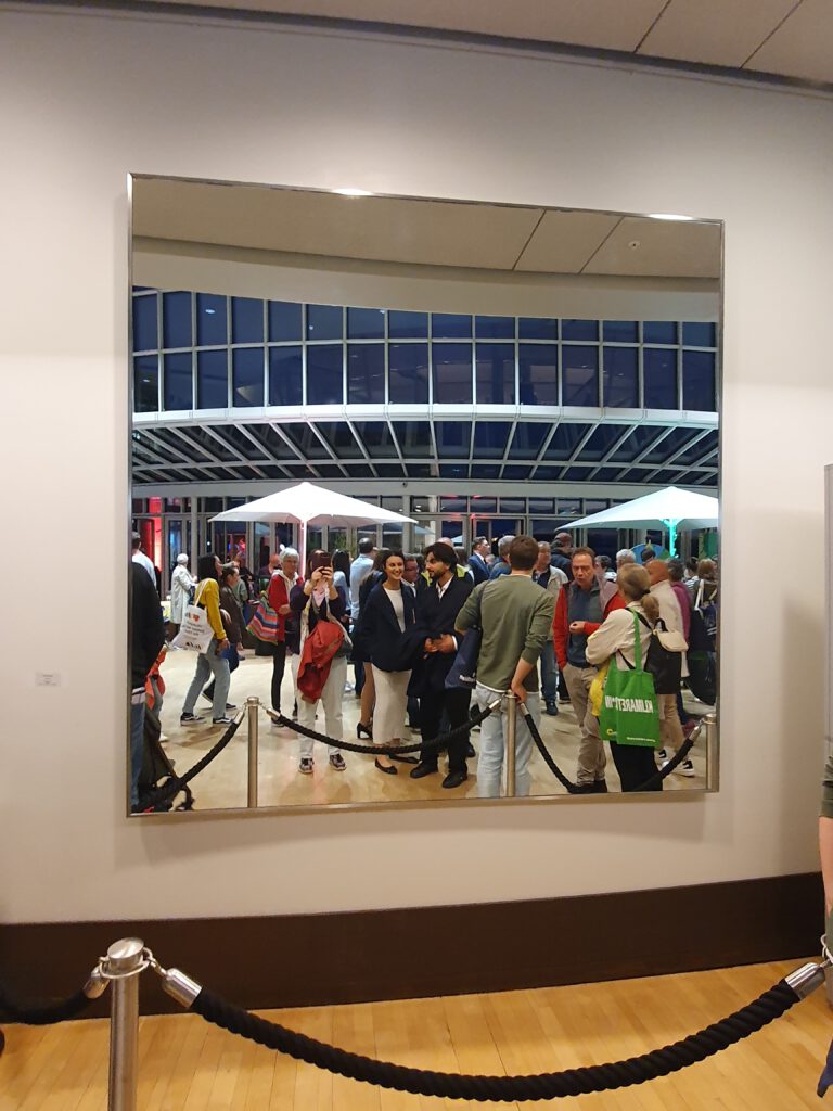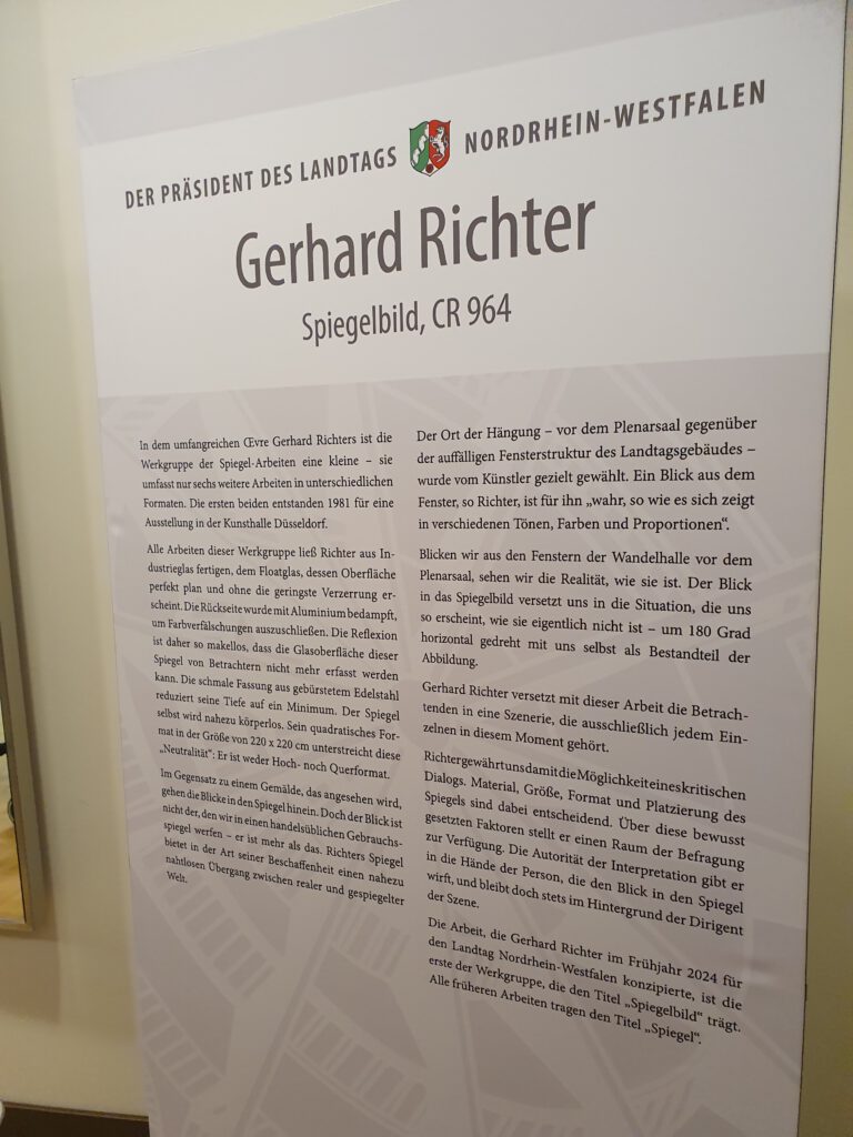 Der größte zeitgenössische Künstler aus Nordrhein-Westfalen, Gerhard Richter, darf natürlich auch nicht fehlen. Sein Spiegelbild konzipierte er im Frühjahr 2024 speziell für die Wandelhalle des Landtags. In ihm spiegelt sich der Himmel, das Draußen – aber auch jeder einzelne Betrachter. Hoffen wir mal, dass die Abgeordneten ob der Auswirkungen ihrer Entscheidungen immer wirklich guten Gewissens ihr Spiegelbild betrachten können.