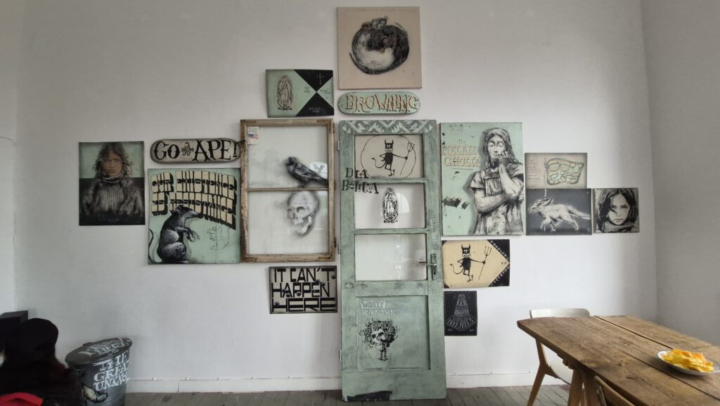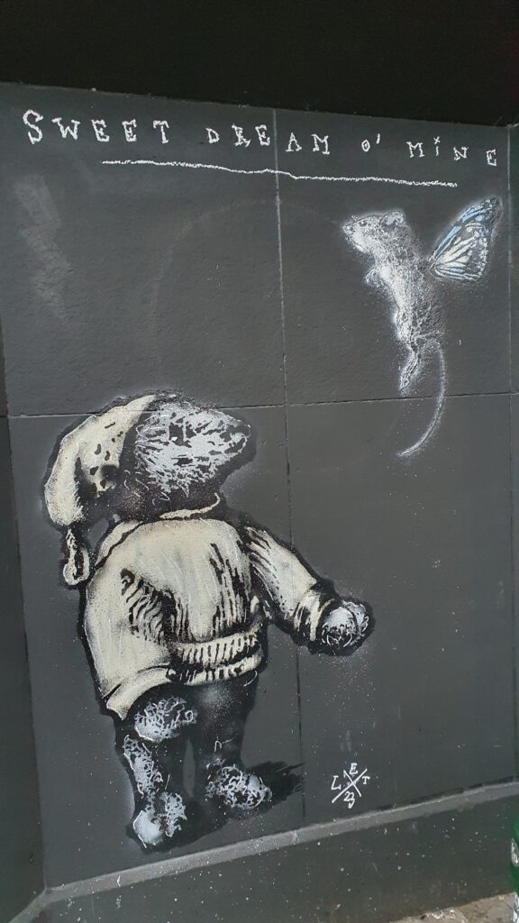 Unweit von Rosskothens Galerie „Pretty Portal“ sind zwei großartige Murals von L.E.T. Das eine heißt „Sweet Deam o’Mine“ und das andere trägt den Titel „FOR THE BRAVE AND DISPLACED“. Beide finden sich in der Friedrichstraße am S-Bahnhof Bilk. Im Sommer 2022 wurde die Unterführung unter der der Brücke – direkt gegenüber des Eingangs zur S-Bahn – von Urban-Art-Künstlern gestaltet. Sowohl auf der rechten als auch auf der linken Seite sind Murals von L.E.T.
