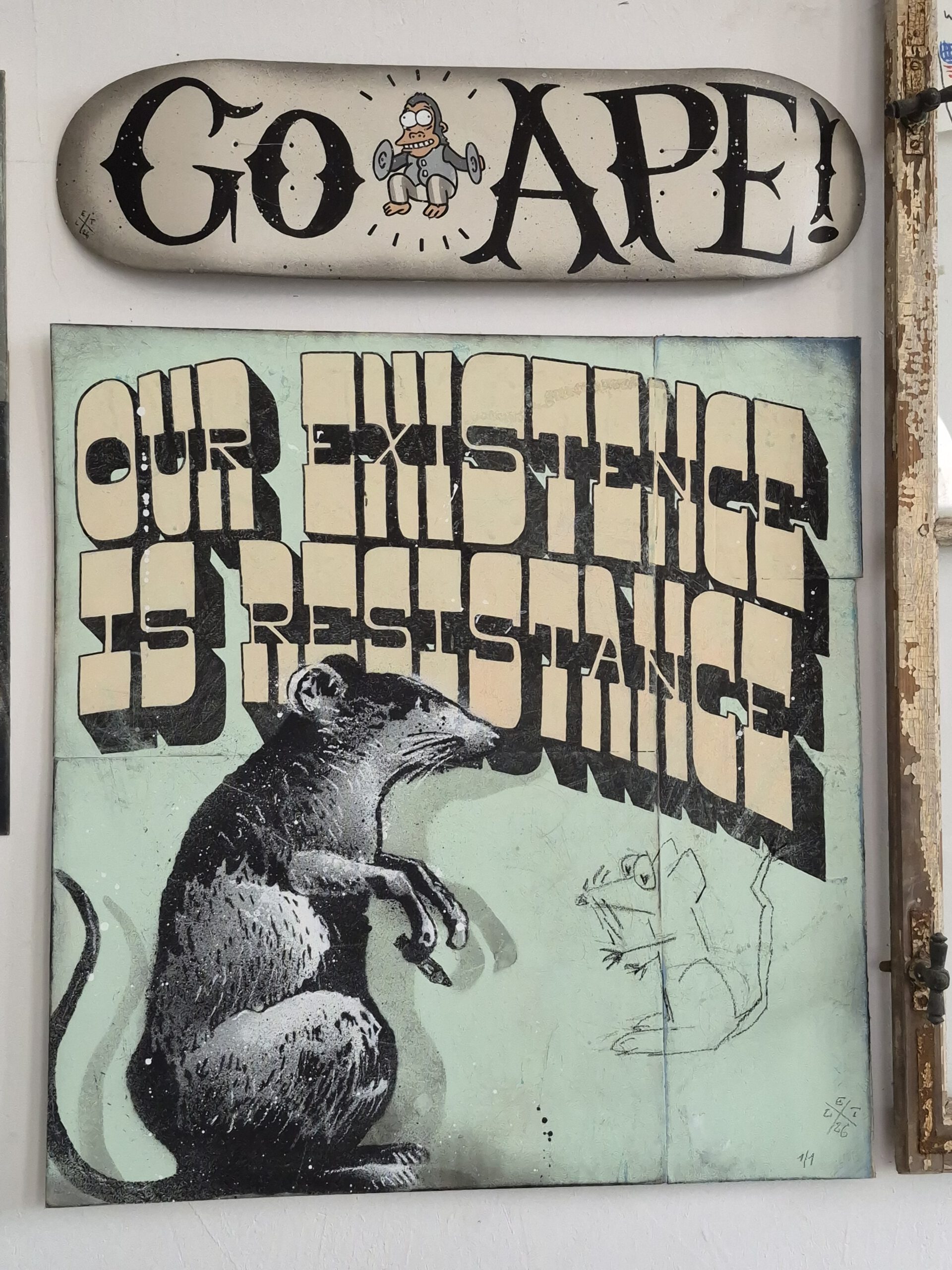 L.E.T. ist französischer Abstammung und lebt im Düsseldorfer Stadtteil Bilk. Seine Spezialität sind Stencils. Er sprüht seine Motive im Atelier auf Papier und plakatiert sie dann als „Cutout“ ins Straßenbild. Ganz in der Tradition von Street-Art greift er sozialkritische Themen auf und kritisiert die Missstände unserer Konsum- und Spaßgesellschaft. Dabei ist er witzig, charmant, provokant, lässt sich von bekannten Kunstwerken inspirieren, weist seinen Werken jedoch durch seine Mischung von Bild und Text eine eindeutige Aussage zu. Oft finden sich Ratten als Motive, die stellvertretend dafür sind, wem denn die Stadt und ihre Mauern und Fassaden gehören. Denn Street-Art ist ursprünglich die Kunst der Underdogs, der Ungesehenen und Übersehenen. Aber L.E.T. porträtiert auch schöne junge Frauen, vielleicht inspiriert von der Mona Lisa?