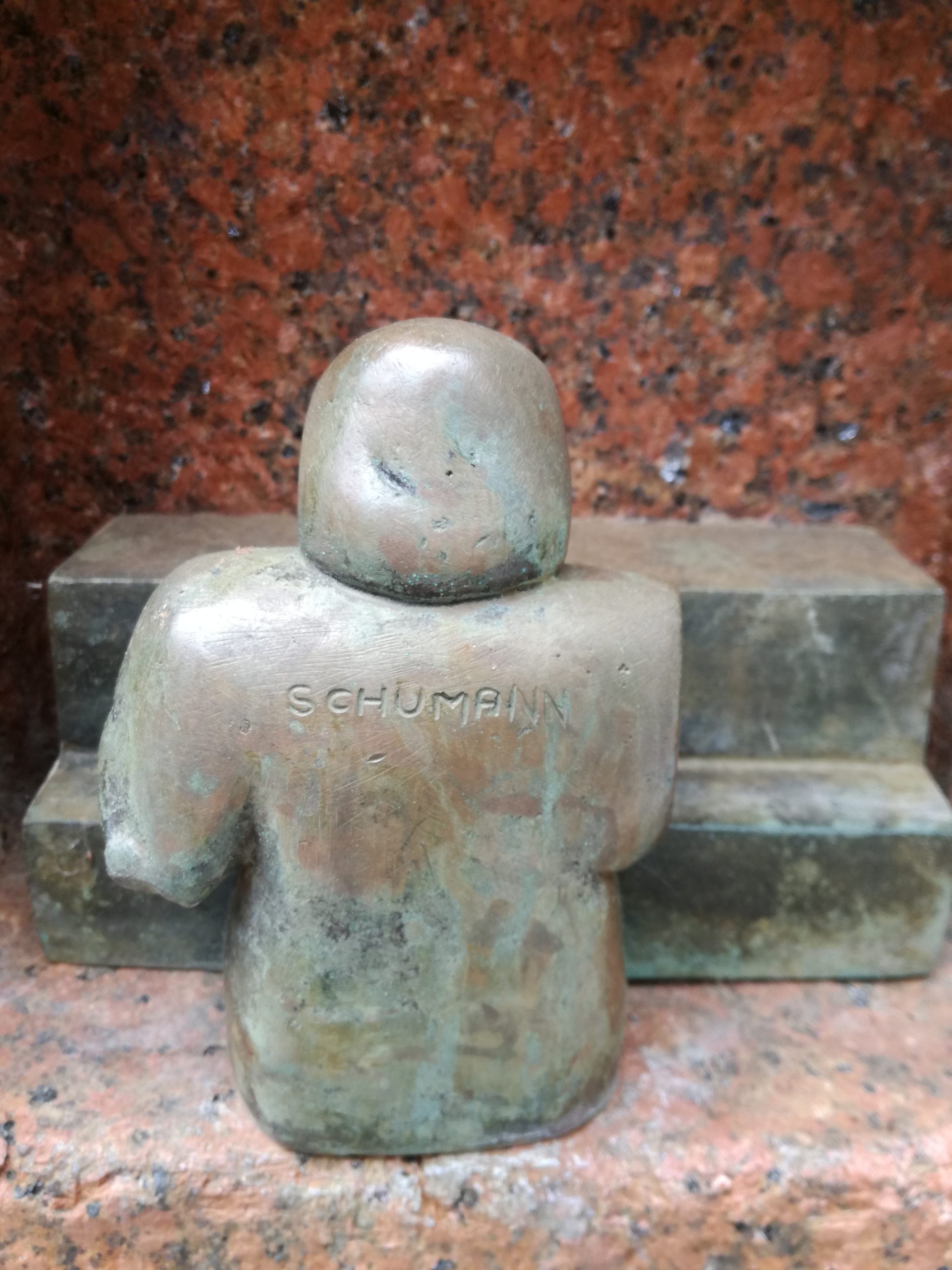 Dieser Brunnen hier ist aus schönem rötlichen Granit, mit Figuren, die Spaß machen. Ganz zuoberst steht der goldene Dirigent, der das Wilhelm-Marx-Haus grüßt, die Rückseite des ersten Bürohochhauses Deutschlands. Dann überrascht seitlich eine Wasser speiende Skulptur, die ich hier einfach mal den Bläser nenne. Eine Art Engel bläst in eine Flöte oder Trompete und erinnert mich auch an die Posaunen von Jericho. Am Brunnenrand steht es ein dunkler Sänger, der mich irgendwie an einen alten Bekannten erinnert: Bariton Stefan Stoll. In den Sänger sind geheimnisvolle Zeichen eingraviert. Drei ebenso dunkle Gestalten spielen Saxophone. In den Rücke des Pianisten steht „Schumann“ geschrieben – eine Hommage an den etliche Jahre in Düsseldorf lebenden und wirkenden Komponisten Robert Schumann. Oder doch eher eine „androgyne“ Version seiner Frau Clara, einer begnadeten Pianistin?
