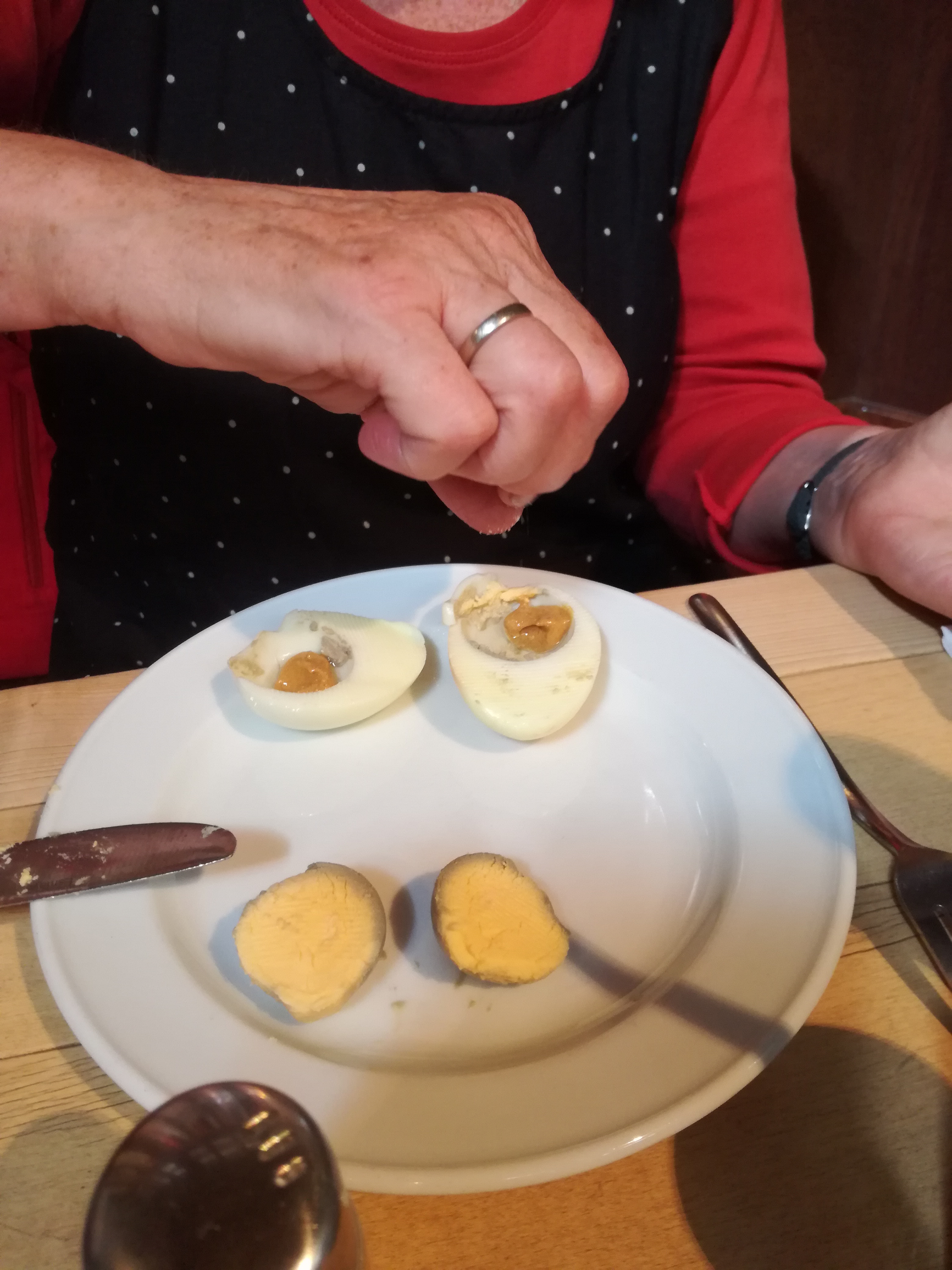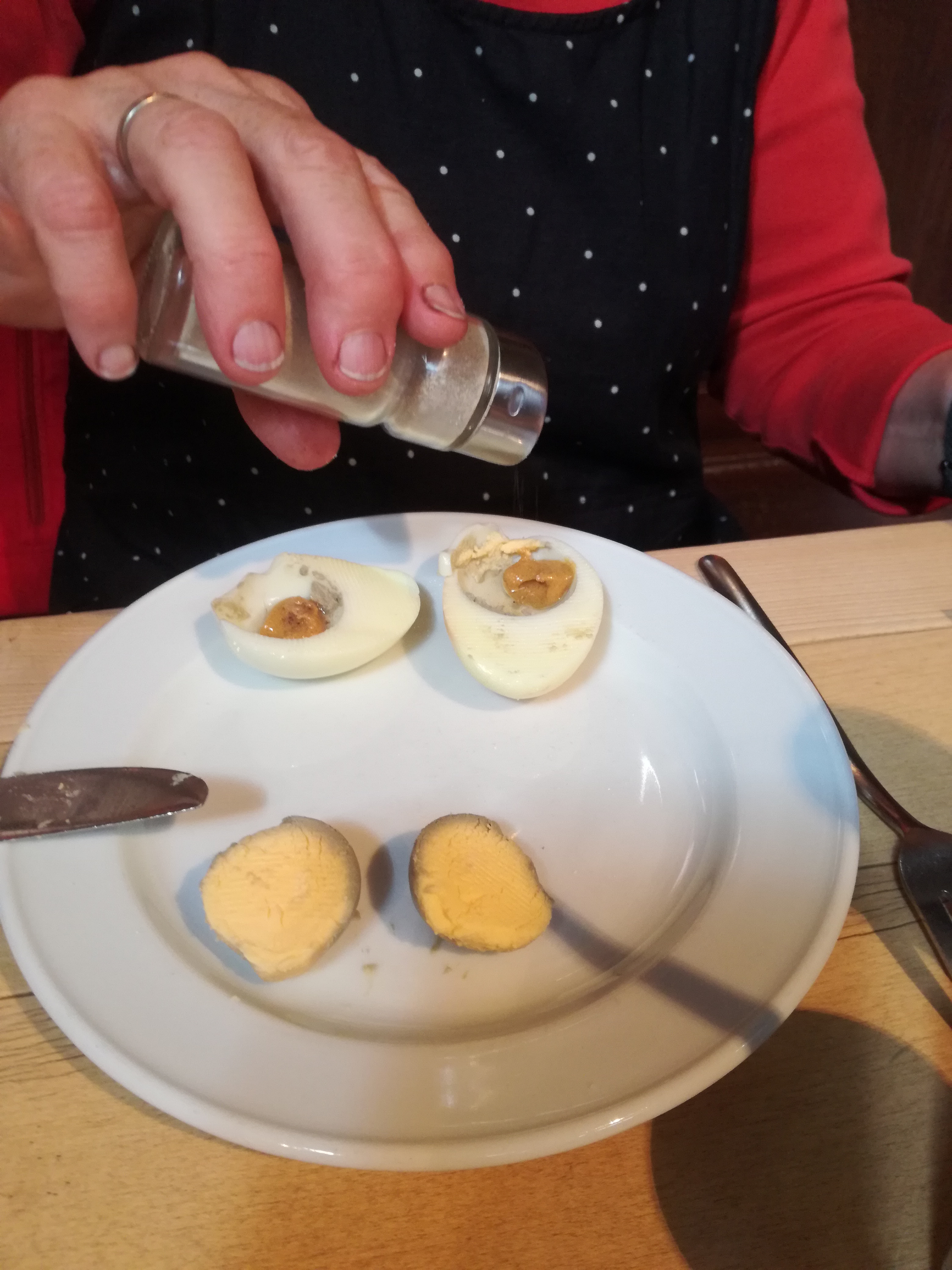 Andere schwören darauf, das Eigelb zu zerdrücken, es mit Senf, Essig, Salz und Pfeffer zu würzen, alles zu vermengen und dann die „Crème“ in das hohle Weiße vom Ei einzufüllen. Einig sind sich jedoch alle: Gegessen werden muss es mit einem „Happs“ und darf nicht „elegant“ abgebissen werden, da es sonst die echte Sauerei gibt, weil es es ausläuft.