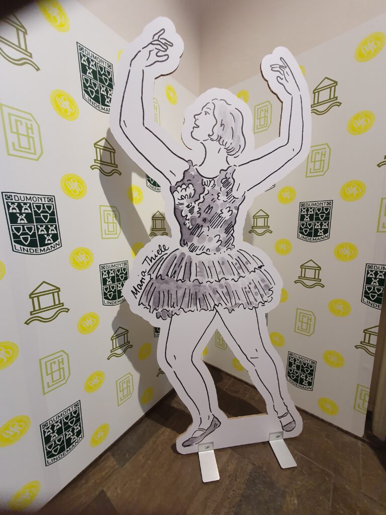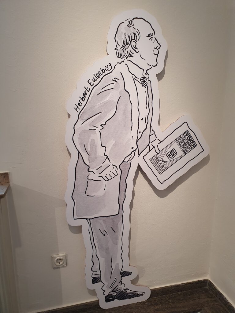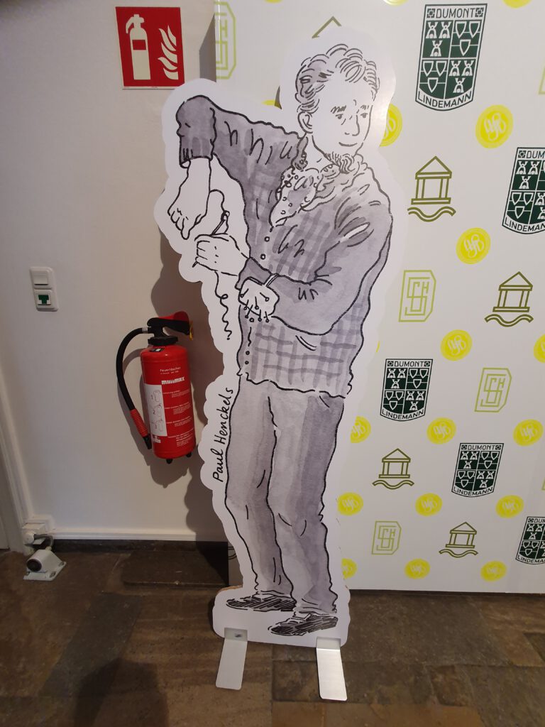 Ein Aufsteller zeigt Paul Henckels. Der Schauspieler ist heute vor allem durch seine Rolle als Professor Bömmel im Film „Die Feuerzangenbowle“ an der Seite von Heinz Rühmann bekannt. „Wat is en Dampfmaschin – da stelle mer uns ma janz dumm…“ ist seine schon fast sprichwörtliche Frage. Henckels war einer der ersten Schüler der 1905 gegründeten Theaterakademie und spielte am Schauspielhaus Düsseldorf. Mehr als 1.000 Mal verkörperte er den Schneider Wibbel und seine Frau Thea Grodtczinsky spielte Wibbels Ehefrau. Unter dem Titel „Wat bin ich eine schöne Leich!“ findet sich ein Blog-Beitrag hier.