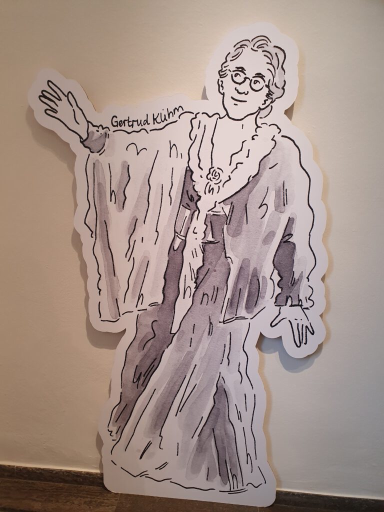 An die „Alleskönnerin“ Gertrud Klihm erinnert der nächste Aufsteller. Sie stellte sich 1907 bei Dumont vor, die ihr „das Kostümliche“ übertrug. Schon wenige Wochen später wurde daraus ein Anstellungsvertrag als „Künstlerischer Beirat“ des Schauspielhauses. Sie entwarf Kostüme, gestaltete den Kostümfundus um, entwarf das Titelblatt der Zeitschrift Masken ebenso wie Werbematerialien und wurde später sogar an der Geschäftsführung beteiligt. Ab 1918 widmete sie sich ihrer eigenen Kunst – dem Zeichnen, Malen und Modellieren von Grafiken, Aquarellen und Ölbildern. 1921 war sie in der Ausstellung Das junge Rheinland in der Kunsthalle Düsseldorf vertreten. Im selben Jahr endete allerdings ihre Düsseldorfer Zeit, denn sie zog mit dem Schriftsteller Hans Franck, der als Dramaturg ebenfalls am Schauspielhaus gearbeitet hatte, in die Nähe von Schwerin.