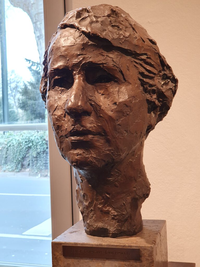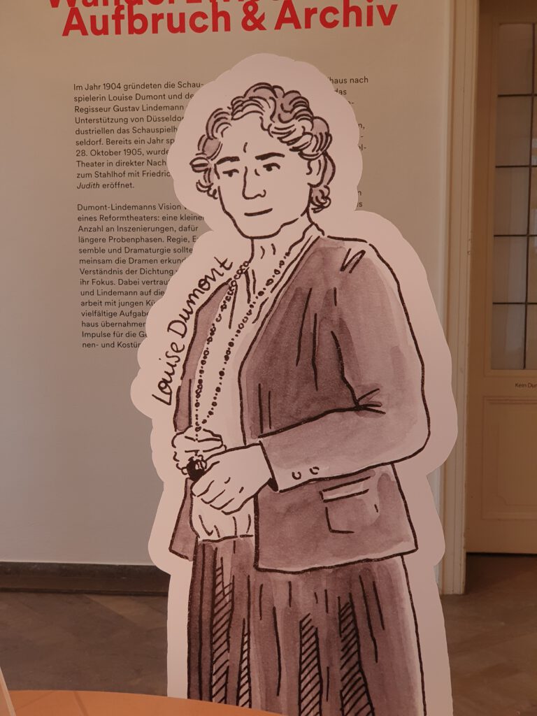 Bei einem Besuch im Theatermuseum – der übrigens sonntags kostenlos ist – begegnet der Besuchende nicht nur den Protagonisten Louise Dumont und Gustav Lindemann, sondern auch anderen wichtigen Akteuren des damaligen Düsseldorfer Schauspielhauses – in Form von Büsten ebenso wie von Aufstell“puppen“. Da sind natürlich allen voran Louise Dumont…
