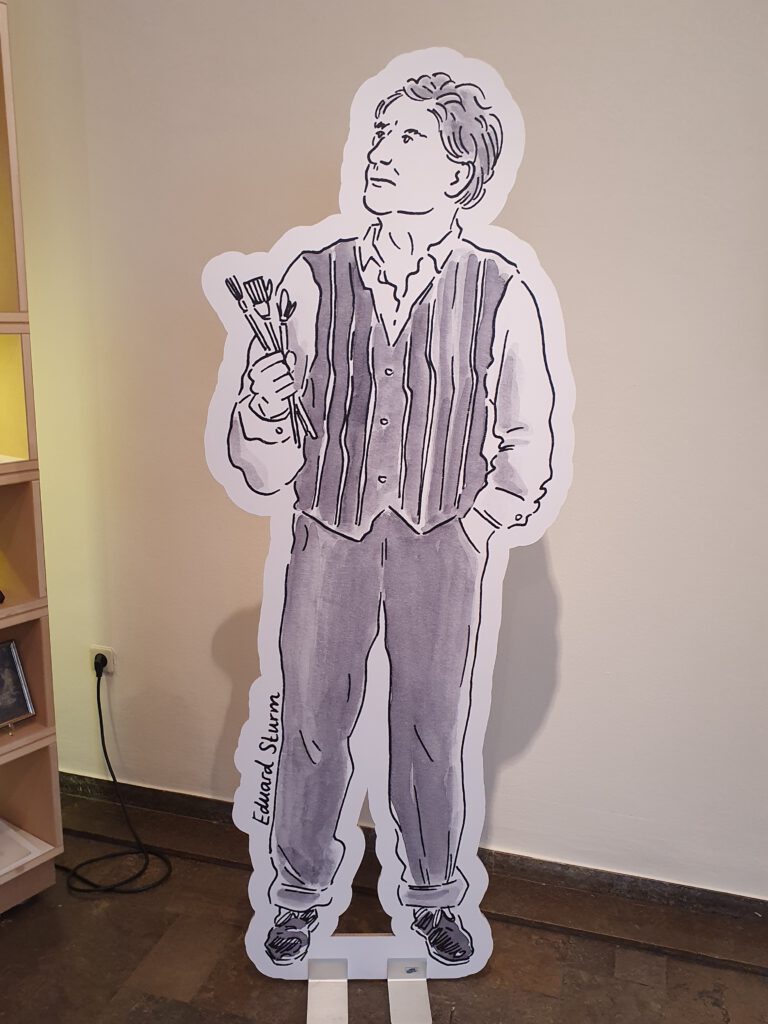 Die Pinsel in der Hand von Eduard Sturm zeigen, dass er fürs Bühnenbild verantwortlich war. Zunächst hatte er eine Ausbildung im väterlichen Dekorationsgeschäft in Hagen erhalten. Als Hagener hatte er Kontakt mit Karl Ernst Osthaus, dem Gründer des Museum Folkwang. Ab 1902 studierte er bei Peter Behres in der Architekturklasse an der Kunstgewerbeschule Düsseldorf. Von 1909 bis 1913 und von 1924 bis 1932 war Eduard Sturm Künstlerischer Beirat am Schauspielhaus Düsseldorf. 1932 wurde er von Otto Falckenberg an die Münchner Kammerspiele geholt, wo er bis 1946 arbeitete. Nach dem Tod seines Mentors ebbte Sturms Karriere allerdings kräftig ab.