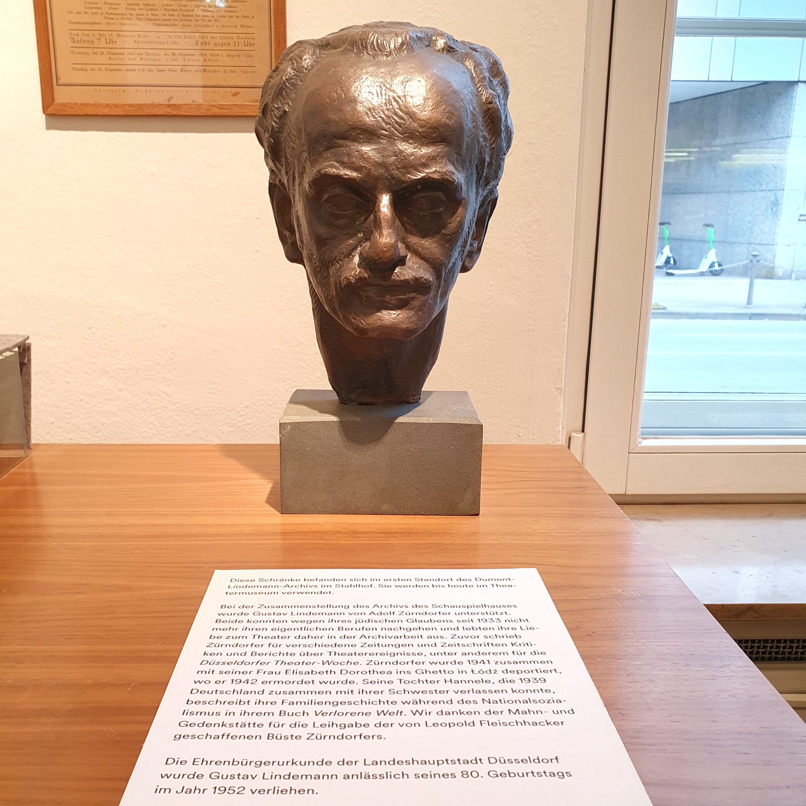 Bei einem Besuch im Theatermuseum – der übrigens sonntags kostenlos ist – begegnet der Besuchende nicht nur den Protagonisten Louise Dumont und Gustav Lindemann, sondern auch anderen wichtigen Akteuren des damaligen Düsseldorfer Schauspielhauses – in Form von Büsten ebenso wie von Aufstell“puppen“. Da sind natürlich allen voran Louise Dumont…
